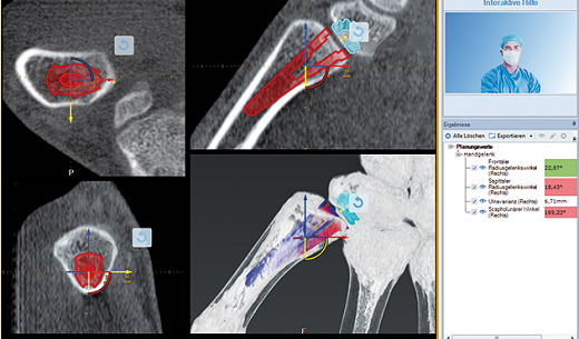 Nhờ các tùy chọn đa dạng do phần mềm chấn thương chỉnh hình 3D Hand cung cấp, các bộ phận cấy ghép riêng lẻ có thể được lắp ráp với sự trợ giúp của bộ tạo hình bộ cấy ghép và đặt vào mô hình 3D (hình ảnh CT của bệnh nhân). Hơn nữa, các mô cấy có thể được điều chỉnh, xoay, di chuyển hoặc thay đổi sang loại mô cấy khác theo nhóm hoặc đối tượng riêng lẻ.
